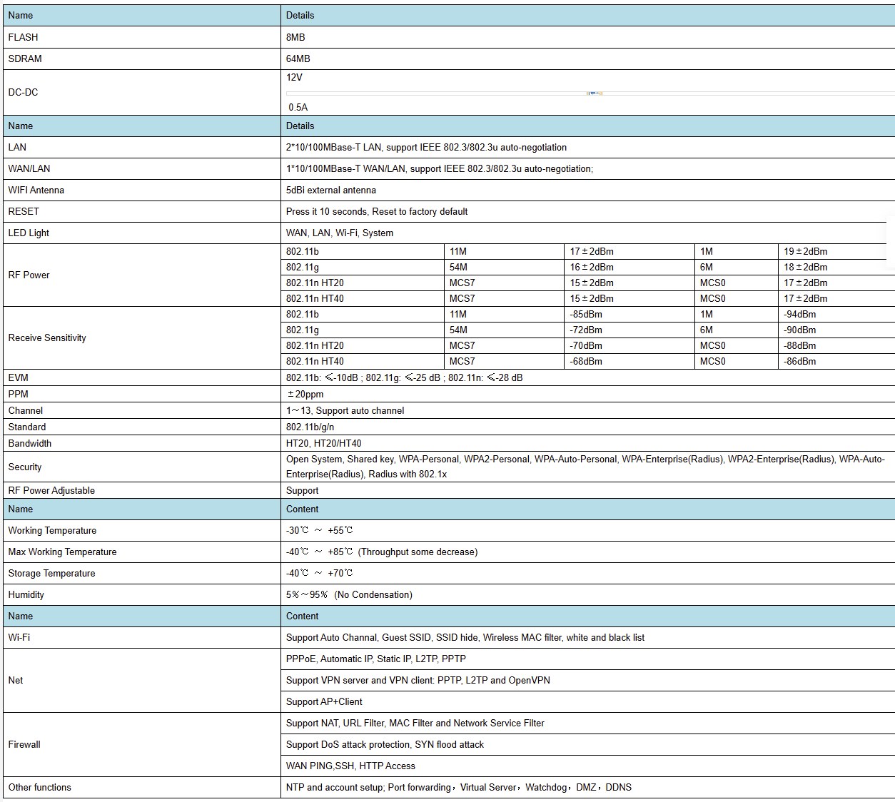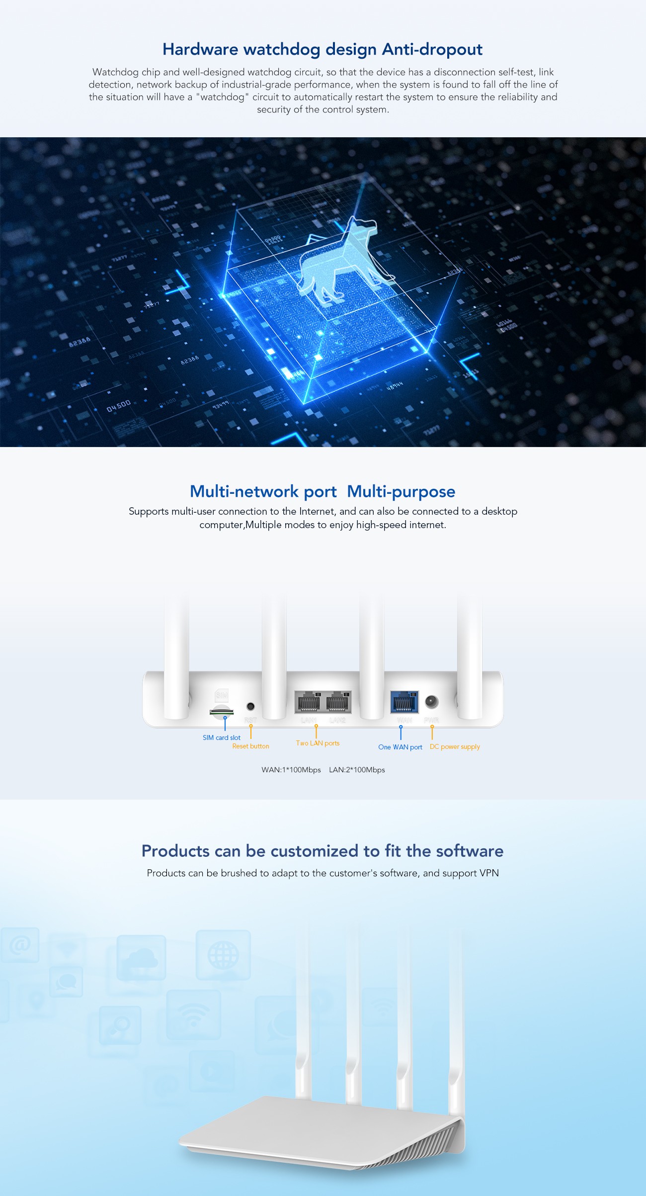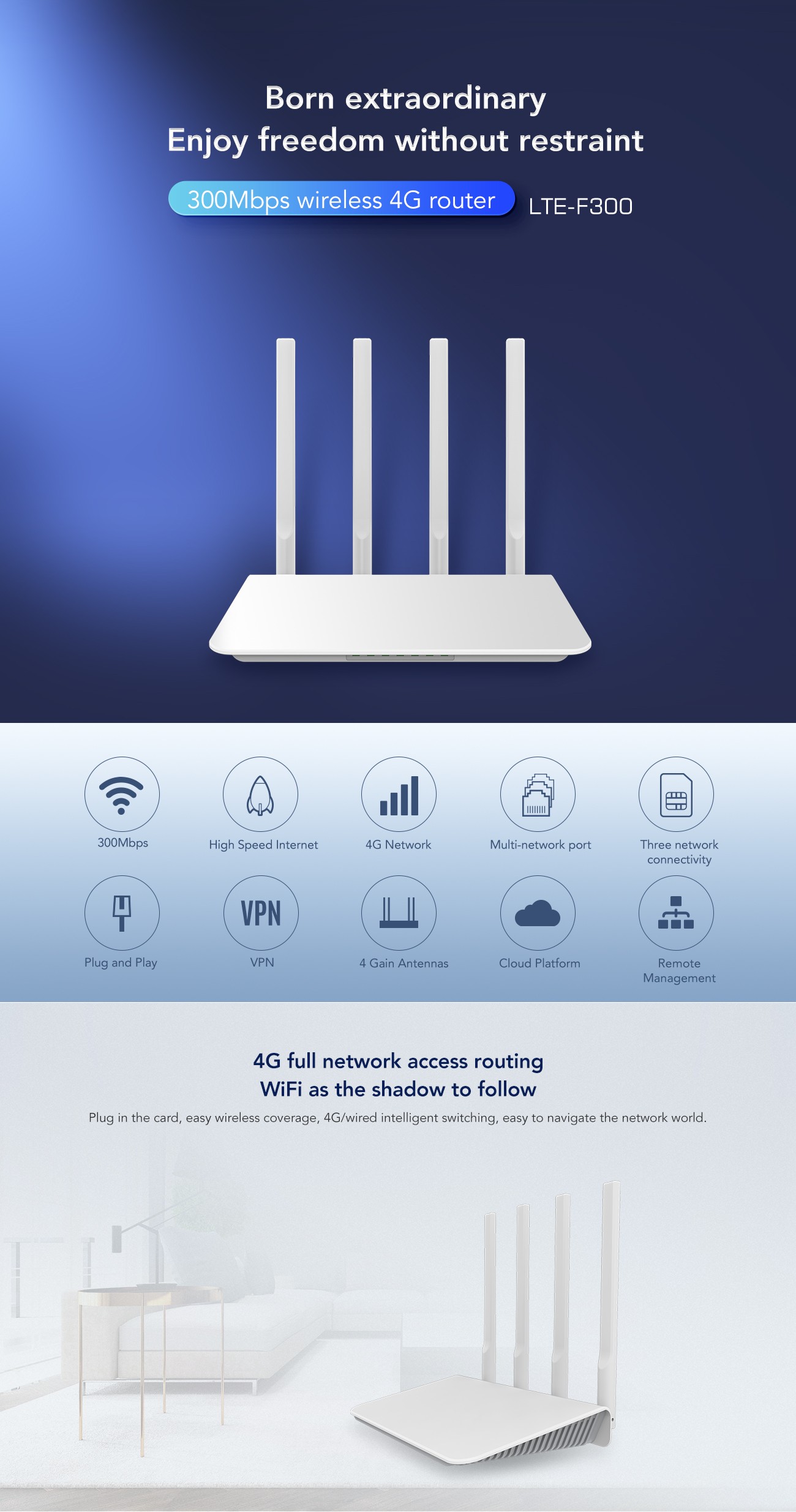 LTE-A30 is an indoor wireless router supports VPN; Comply with IEEE 802.11b/g/n MIMO standard, the data rate up to 300Mbps, more than 30 end users can access into it; There are 3*10/100Mbps WAN/LAN ports, can be managed by cloud server or APP.
