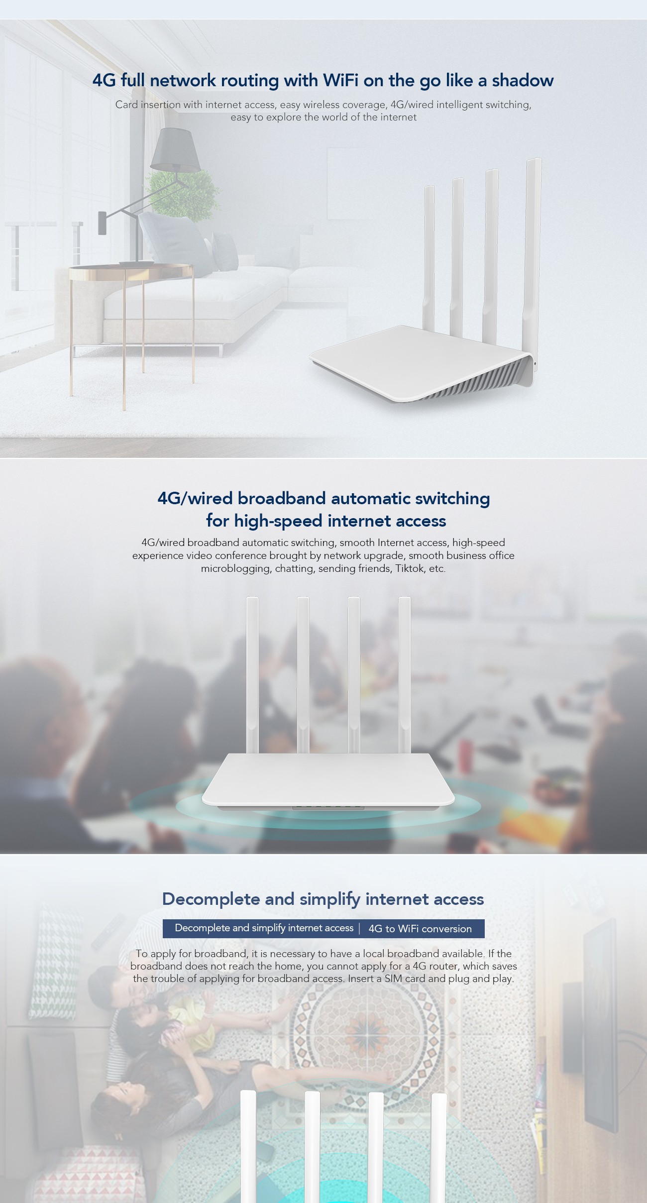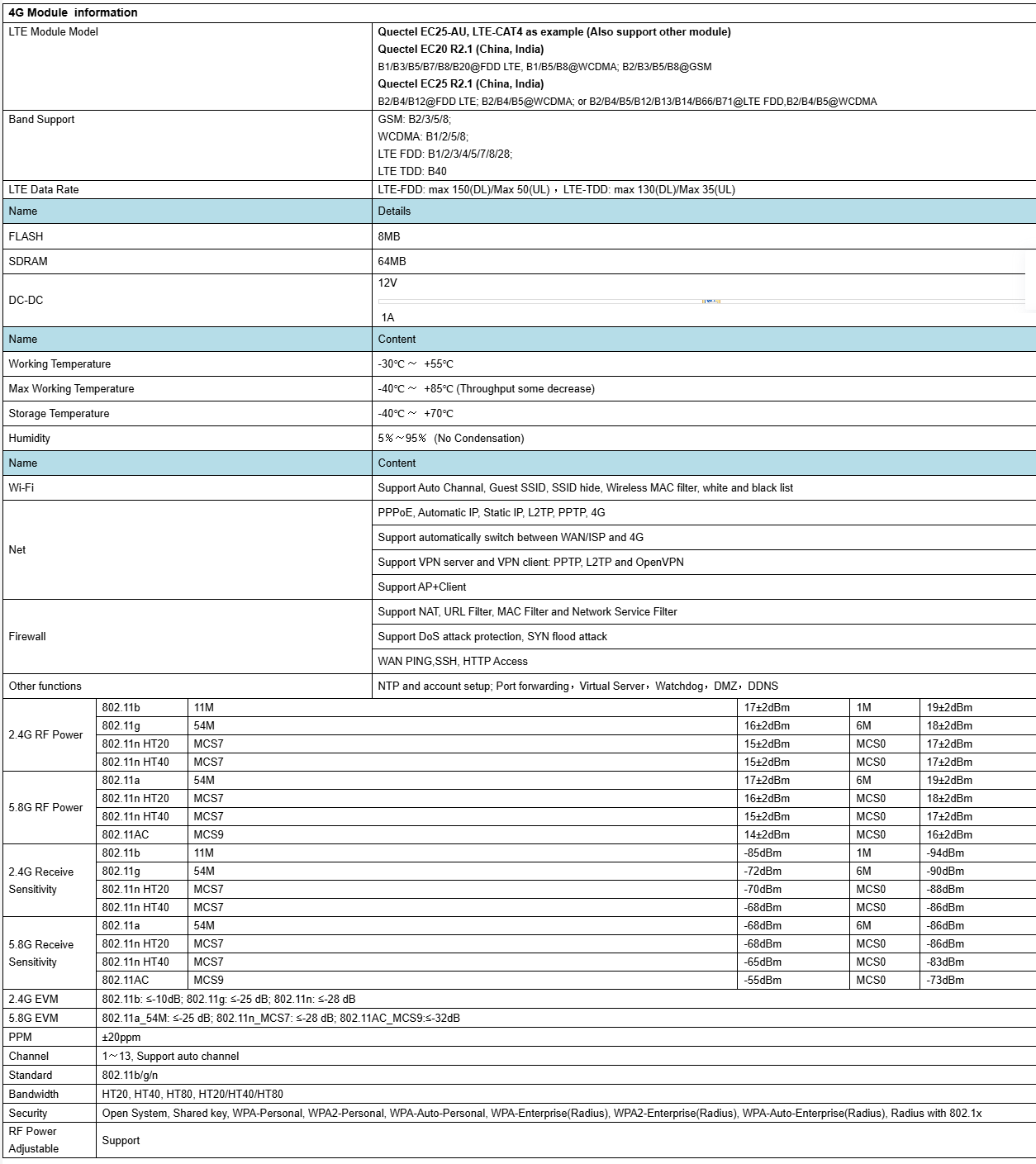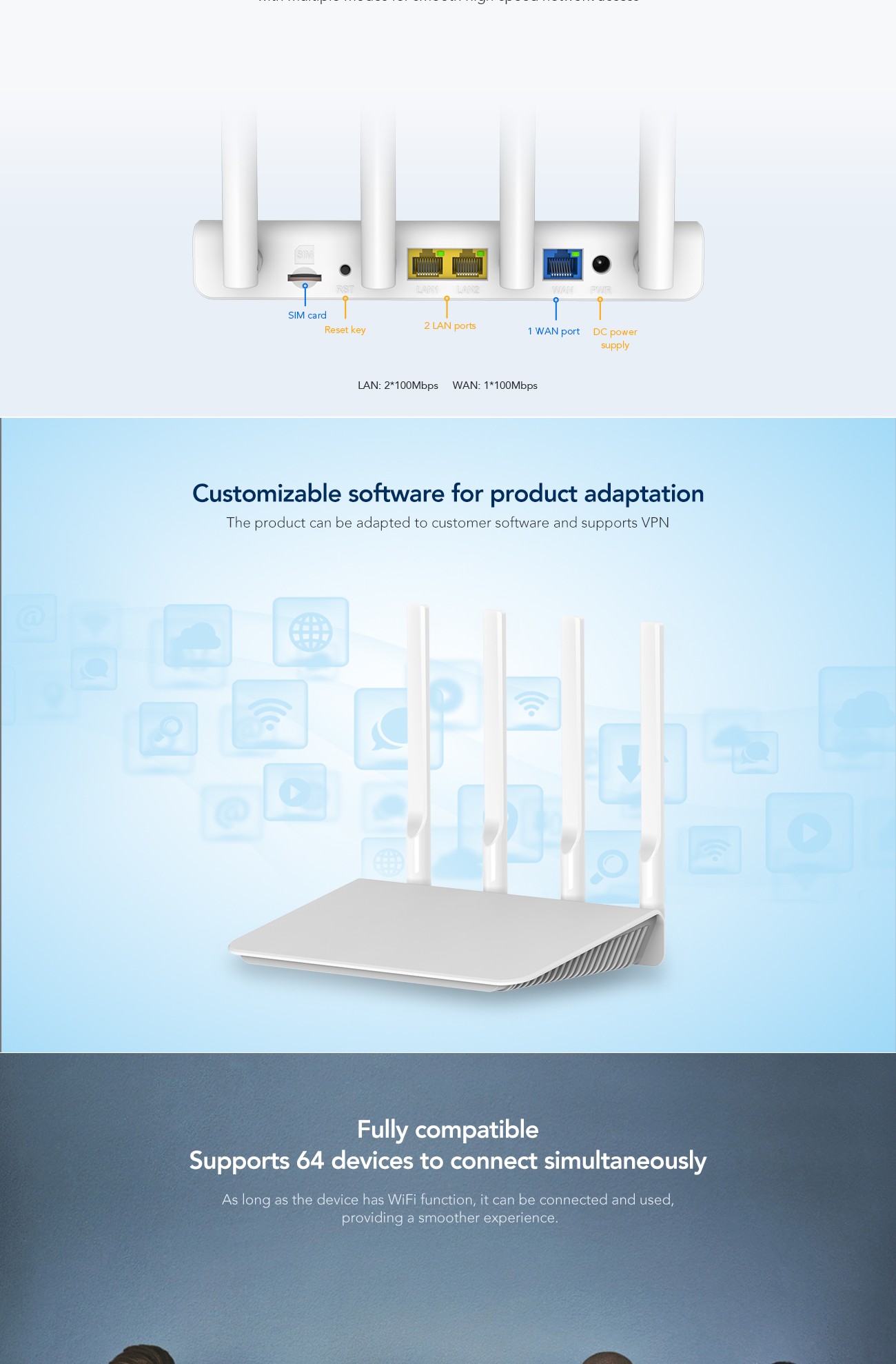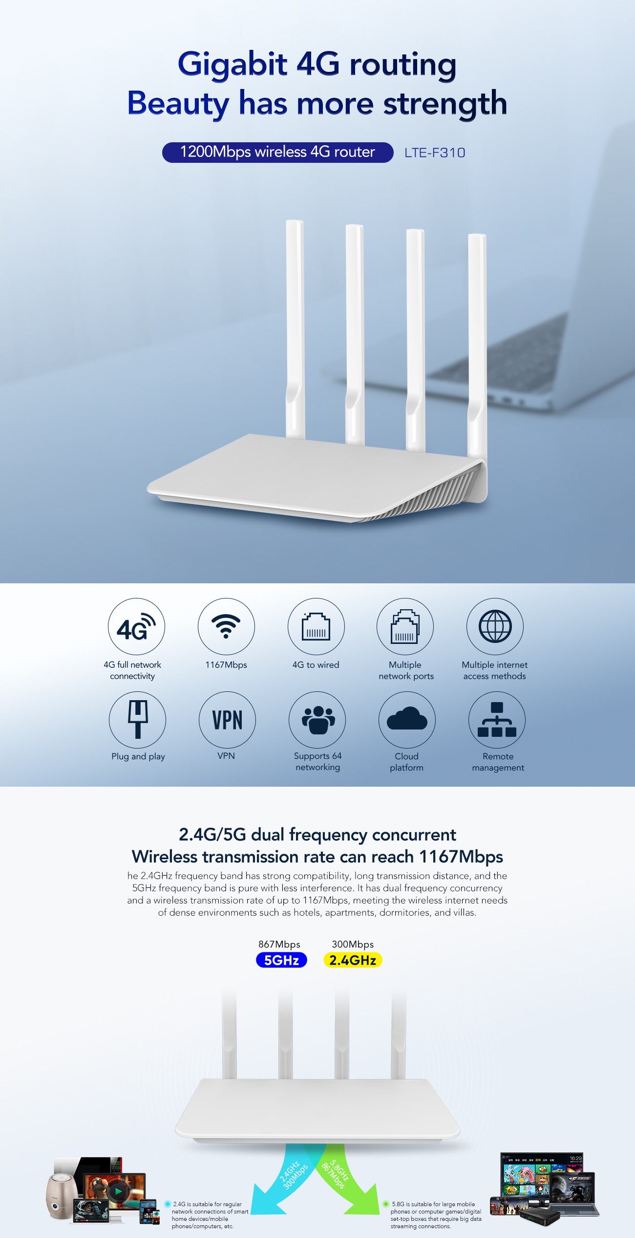 LTE-F310 is an 11ac 4G router, which can provide 2.4G and 5.8G wireless services, this product supports VPN, wired/wireless backup, cloud platform, remote management, and can provide users with a variety of networking methods, so that users can use a wider range of application scenarios.